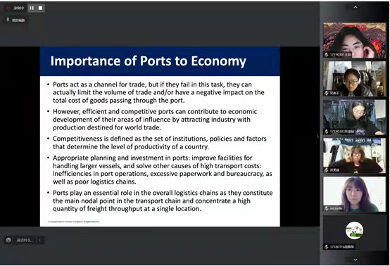 Raymond教授此次专题讲座的主题是《Transport Infrastructure and Operations in a Port Economy》。讲座从港口规划设计、港口交通需求预测、港口腹地可达性三个方面出发,分享了海运行业的背景、发展、机遇与挑战。为加深对此次专题讲座的专业性理解,Raymond教授通过对新加坡Tuas超级港、Pasir Panjang集装箱码头以及德国汉堡港、威廉港的案例分析,深入浅出地介绍了各种预测方法和基础设施的应用场景,分析了港口建设对于腹地经济的影响作用。理论与实践的结合激发了全体项目学员的专业兴趣,令师生们在海洋运输与交通基础设施建设等相关领域有了进一步的认识和思考。在交流讨论环节,Raymond教授与师生们就港口建设、低碳运输以及疫情影响下的海运贸易等问题进行了深入交流。歪歪漫画