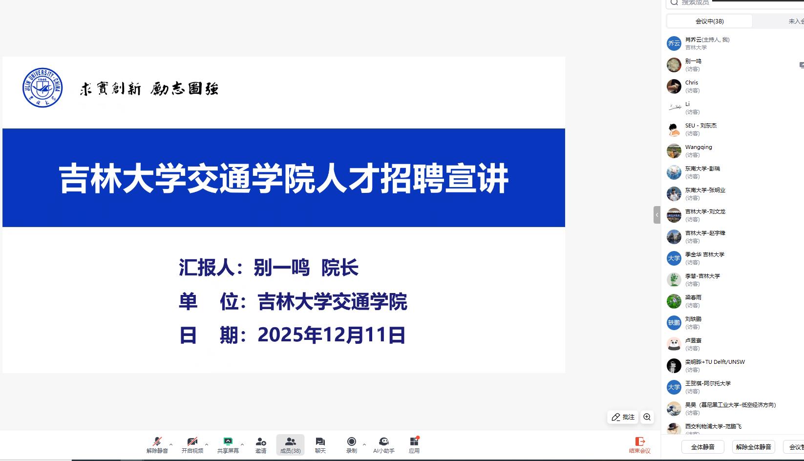 于2025年12月11日下午成功举办了线上人才招聘宣讲会。本次宣讲会通过腾讯会议平台进行,吸引了来自海内外40余位青年学者云端相聚,共话发展。会议旨在全面展示学校的综合实力、学院的发展愿景与求贤若渴的诚意,取得了良好成效。