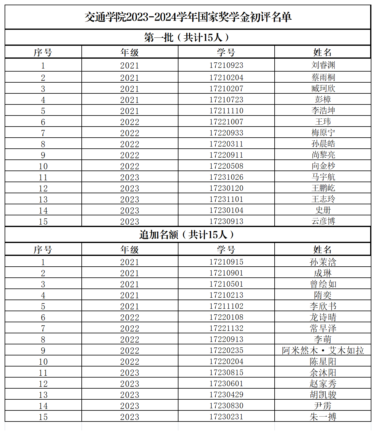 国家奖学金(包含追加名额)初评结果。现将结果公示如下: