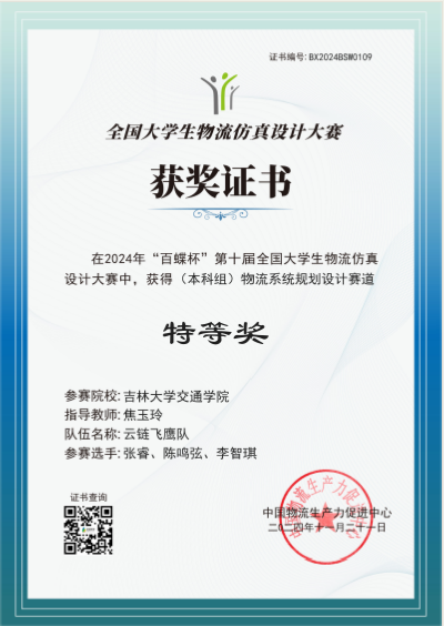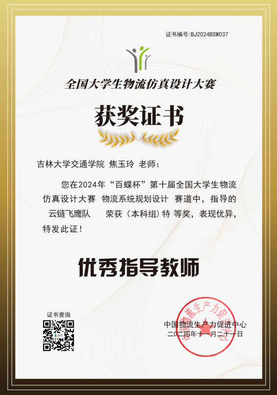 近日,2024年“百蝶杯”第十届全国大学生物流仿真设计大赛顺利落下帷幕,我院焦玉玲老师指导的参赛团队喜获国家级特等奖。